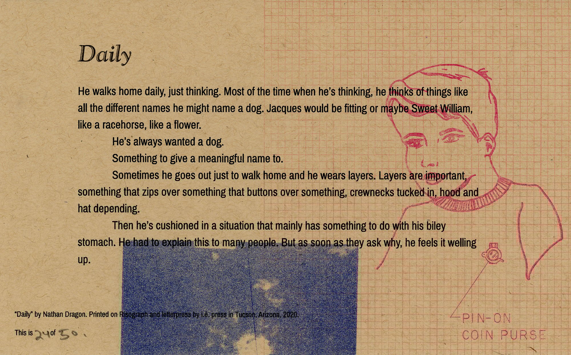 8.5” x 5.25” letterpress/risograph broadsides Text by Nathan Dragon, design and printing by Will Stanier at i.e press